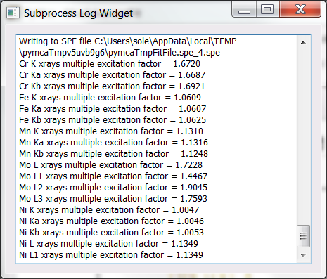 If XMI-MSIM is not installed, the MC Matrix Spectrum button will not be shown. If it is installed, you can also calculate the corrections using it. You just need to press the MC Matrix Spectrum button. You should get a window open where the output of the code will be shown. Under windows sometimes you need to use the 32-bit version of XMI-MSIM. The first time you run the XMI-MSIM code for a given detector and geometry it can take quite long. Subsequent runs are very fast for a Monte Carlo code. Besides showing the Monte Carlo calculated spectrum following 1 or 4 interactions in the sample, the logging window will show you the corrections we are interested on.